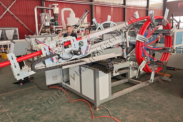 У 2025. години, успешно смо испоручили два прилагођена сета аутоматских машина за намотавање ПЕ цеви водећем аргентинском предузећу за прераду пластике. Клијент је захтевао високоефикасна решења за намотавање како би одговарала њиховим новопроширеним линијама за екструзију ПЕ цеви велике брзине. Наруџбина се састојала од две специјализоване јединице: једне аутоматске машине за намотавање са две станице оптимизоване за цеви пречника 15-32 мм, и другог модела великог капацитета дизајнираног за пречнике 20-63 мм. Ове машине се неприметно интегришу са брзим линијама за екструзију ПЕ цеви за аутоматско намотавање цеви у униформне ролне. Опремљена системом за аутоматско бројање дужине, машина покреће аутоматско сечење и пренос станице када се постигне циљна дужина. Истовремено обезбеђује готову ролну и активира аларм за паковање, пружајући потпуно аутоматизовано решење за намотавање. Ригорозно фабричко тестирање пре испоруке обезбедило је стабилан рад на лицу места након испоруке.