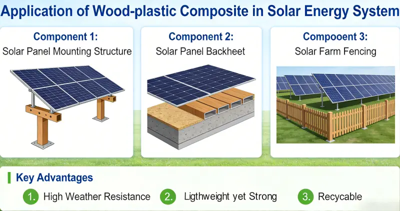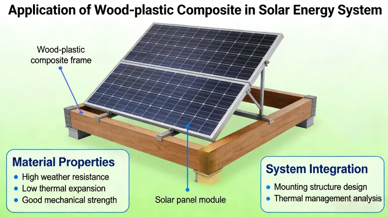 Дрво-пластични композити су еволуирали од помоћних материјала до основних структуралних и функционалних материјала у системима соларне енергије, показујући значајне предности у фотонапонским системима за монтажу, плутајућим електранама и интегрисаним фотонапонским системима (БИПВ). Са будућим напретком у оптимизацији формулације, структурним иновацијама и смањењу трошкова, њихова примена ће се даље ширити, позиционирајући их као један од кључних материјала за зелене, нискоугљеничне и дуготрајне системе соларне енергије.