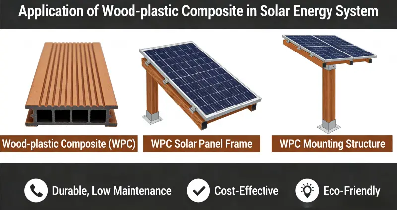 Композит дрво-пластика (ВПЦ) се појавио као кључни материјал у системима соларне енергије, укључујући фотонапонске (ПВ) носаче, плутајуће електране, интеграцију ПВ зграда и концентрисано складиштење соларне енергије (ЦСП), због својих еколошки прихватљивих, отпорних на временске услове, лаганих, лаких за одржавање и лаких својстава. Он прогресивно замењује традиционалне металне и дрвене материјале.