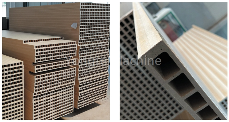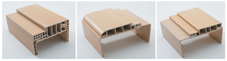 ПЕ пластика + 10%-15% ојачана стакленим влакнима + 50-60% прах од дрвета + коекструдирани слој против старења + ојачана структура |